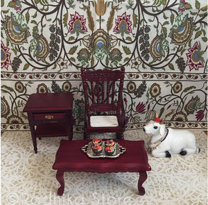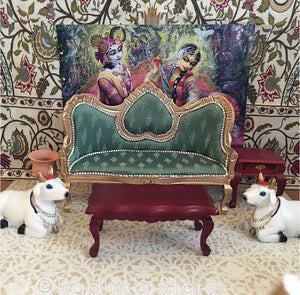 This lovely wood, fancy carved table can be used for meditation when making your bhoga offerings to your Lordships.. It sits nicely in front of a throne or Asana.
