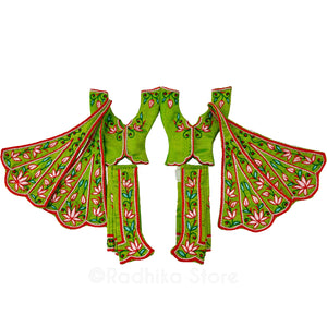MUST READ HOW TO CHOOSE SIZE See below. NOTE: Very fitted Kurtas. If your Deities are chubby or hae extra large hands, it may not fit. Hand-made in Vrindavan by ISKCON Devotees. Best quality. Detailed, first-class embroidery. Lovely outfit! Soft, pure silk including silk lining! All sewn, not cut or glued edges. No strings to cut. Beautiful outfit. Not stiff. Nice Kurta design. Nicely fitted 1/2 sleeve to show off Their Bangles. Pond Green with pink lotus, teal green leaves, and bright pink/Red trim.