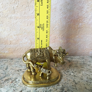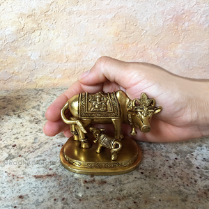 Auspicious Solid Brass Mother Cow and Calf With Ganesh Blanket Place on your altar or any sacred place. In Vedic Culture Lord Krishna Says that the cow is our mother because she supplies us milk. Cows must be protected by all means. Lord Krishna says in Srimad Bhagavatam that one can worship cows just as you should honor your own mother. There are seven worship able mothers. Including ones own mother and the cow as she supplies us milk.