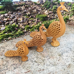 Darling Hand Carved Govardhana Peacocks,With a Baby Peacock Inside. There is no seam. The baby peacock was carved from the outside. Put on your altar, on a book shelf or mantle or any place you like.