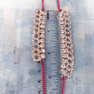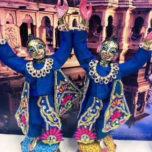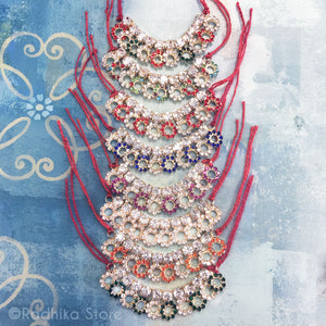 From Vrindavan - Beautiful, Good Quality Rhinestones Deity Necklace. Please see pictures for the sizes. Choose your size accordingly. (Please do measurements to make sure you get the size you need.) The string is interchangeable. You can put any color string you like. Some devotees like to use a metallic string.