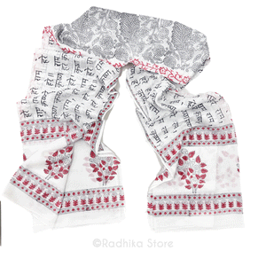 Beautiful, Rare Design, white with black color, Block Print, Sanskrit Maha Mantra and Red Vrindavan Peacocks design. High Quality, sheer, 100% pure cotton, Extra Long.