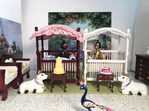 This table is plastic and painted brown. It can be used as a night stand, next to Their bed or next to a throne, or as a miniature eating table. A table can be used for meditation when making your bhoga offerings to your Lordships..