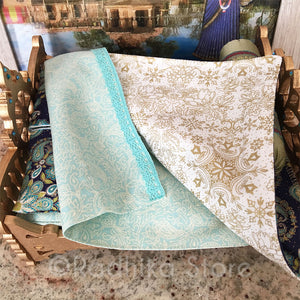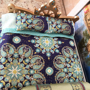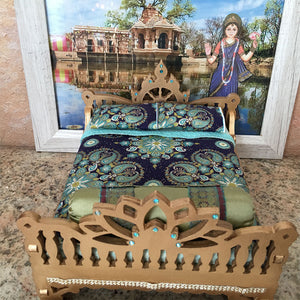This strong, well-made, wood Deity bed, is exclusively made for Radhikastore. We painted the bed antique gold and added light teal color Swarovski crystals. We made the pillows and the nice firm, comfortable mattress, about 3/4" inch thick, 7 1/2" inches long, by 6" inches wide. You can put your under 7" inch tall Deities in this bed. (The bed itself is 8" long, by 7" inches wide. The Chakra headboard is 5" inches tall at the highest point, and the lotus footboard is 4" tall. It comes as seen in photos. For those who like high quality, soft cotton fabrics ... Double-sided cotton bedspread. With a deep blue mesmerizing night sky. With a double-sided cotton top sheet with trim, (cream and soft sea green) and a fully covered cotton bottom sheet, double-sided blanket, cream with gold pinstripe, two cotton pillowcases, and a olive green silk bolster pillow with trims.
