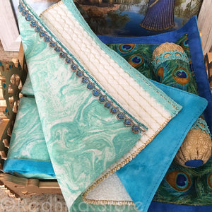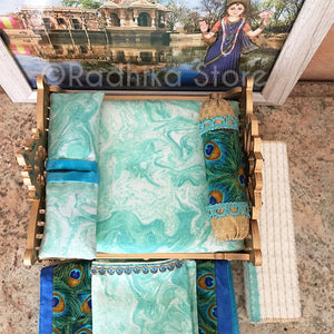 This strong, well-made, wood Deity bed, is exclusively made for Radhikastore. We painted the bed antique gold and added teal color Swarovski crystals. We made the pillows and the nice firm, comfortable mattress, about 3/4" inch thick, 7 1/2" inches long, by 6" inches wide. You can put your under 7" inch Deities in this bed. (The bed itself is 8" long, by 7" inches wide. The Chakra headboard is 5" inches tall at the highest point, and the lotus footboard is 4" tall. It comes as seen in photos. For those who like high quality, soft cotton fabrics ... Peacock feather design bedspread with reverse side. With a double-sided cotton top sheet with trim, and a fully covered cotton bottom sheet, (sea green marbelized design). double-sided blanket, ( cream with gold pinstripe), two cotton pillowcases, and a cotton bolster pillow with trims.
