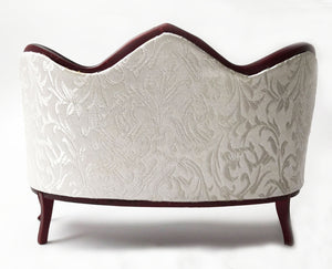 Lovely cream, vine imprinted, silk satin, jeweled, tall back, mahogany throne.