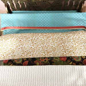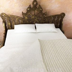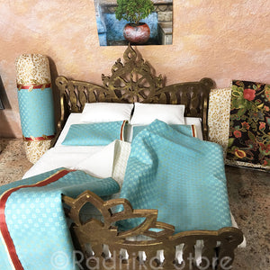 This bed is exclusively made for Radhikastore. We paint the bed with a metallic look, of bronze and gold, marbleized or patina look. We made the pillows and the mattress and all the bedding. The mattress cover comes off and has a cream flower imprinted cotton fabric as do the pillows.