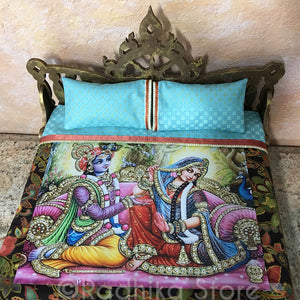 You can actually put your Deities in this bed (9", 10" 11" or 12" Deities). Strong well-made wood bed. The nice, firm, yet soft mattress is 13 1/2" inches long by 12" inches wide. (The bed itself is 14 1/2 " long and 13 inches wide. (King size bed). The Chakra headboard is 10 1/4" inches tall and the Lotus footboard is 9" tall. It comes as seen in photos. For those who like high quality, soft cotton fabrics ... (colors of bronze, gold, teal, rust cream, and more) Two-sided cotton bedspread, teal with gold, cotton top sheet, and fully covered cotton bottom sheet, (mattress cover) cream with gold thread blanket, two pillows and a bolster pillow. The fabrics have a golden sheen to them.