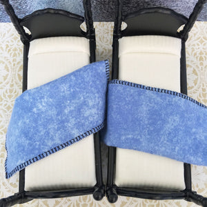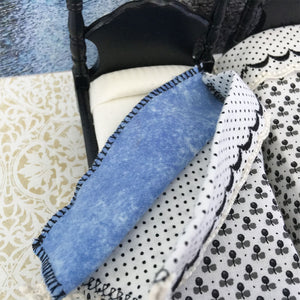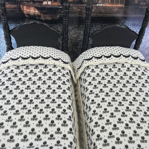 Darling black painted wooden bed set, (two single beds), very well made. Soft, pure cotton Black and white, dot design bed cover. The mattress is 5 1/4" inches long and 2 3/4" wide and the bed itself is 5 3/4" inches long and the tallest poster is 3 3/4" inches tall and the headboard is 2 3/4" Tall. Each bed comes as seen in photos with a cotton blue blanket and attached pillow.