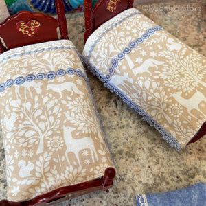 Choose - Set of Two Beds- With Vrindavan forest design bed cover, (trees, flowers, birds, deer, squirrels, fox, bunnies, cow and stars). Sand and white color with sky blue (two single beds), very well made. Soft, pure cotton, bed cover. Each bed comes as seen in photos with soft, sweet cotton sheets a blue cotton fleece blanket, and a pillow. Sweet heart on the head boards and foot boards. It is a sticker that can be removed easily if you want. A little vine comes with the beds to put as you like.