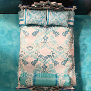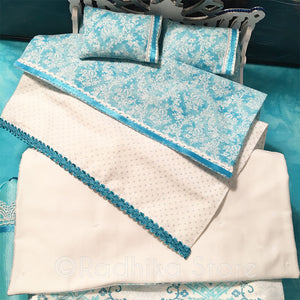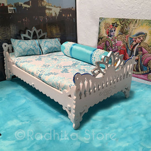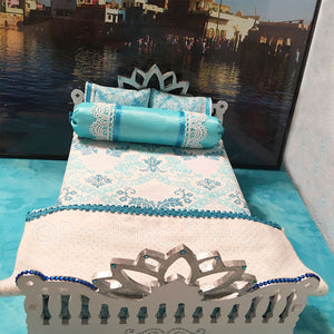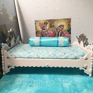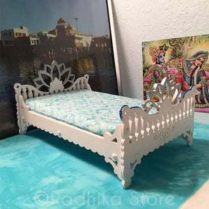 This bed is exclusively made for Radhikastore. We paint the bed creamy milky white with silver and added jewels, we made the pillows and the firm and nice comfortable, over 1" inch thick mattress and all the bedding. You can actually put your Deities in this bed (9", 10" 11" Deities). Strong well-made wood bed). The nice mattress is 12 1/2" inches long by 8" inches wide. (The bed itself is 13 " long by 9" inches wide. The Lotus headboard is over 6 3/4" inches tall at the highest point, and the lotus footboard is 6" tall. It comes as seen in photos. For those who like high quality, soft cotton fabrics ... (Watercolors of teals and blues and milky white) Two-sided cotton bedspread, (pure white on opposite side), with a double sided cotton top sheet, fully covered cotton bottom sheet, cotton flannel double-sided blanket, two pillows and a fancy taffeta fabric bolster pillow with trims.