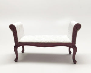 This lovely mahogany seat, with white imprinted fabric. sits nicely in front of a bed or anywhere on the altar.