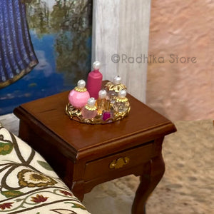 This Miniature Perfume tray is gold color. (not real gold) It is a mock up perfume tray. Not real perfume bottles, not real perfume. Comes with 7 bottles and tray (They do not come off)