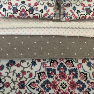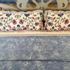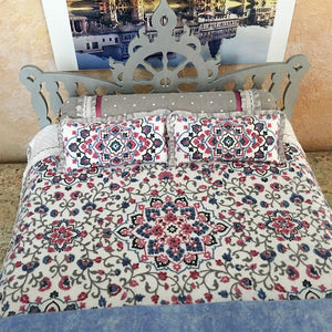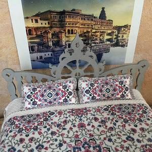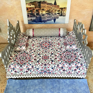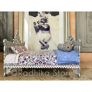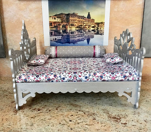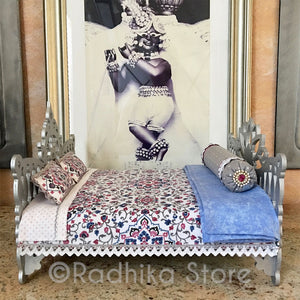 This well-constructed, wood bed is exclusively made for Radhikastore. We paint the bed, make the pillows and the mattress and all the bedding. You can actually put your Deities in this bed (9", 10" 11" or 12" Deities). The nice, firm mattress with nice white cotton fabric, is 13 3/4" inches long by 12 1/4" inches wide. (The bed itself is 14 1/2 " long and 13 inches wide. The Chakra headboard is 10 1/4" inches tall and the Lotus footboard is 9" tall. It comes as seen in photos. For those who like very high quality, soft cotton fabrics ... The entire bedding is pure cotton flannel, warm for fall and winter seasons.  (The flannel sheet are white with pink Krishna polka dots), fully covered flannel bottom sheet, and top sheet with cotton trim. Two pillows and a bolster pillow. Warm Flannel blue blanket, with an embroidered edge. Double-sided cotton bedspread (Gray with Krishna Polka Dots and the upper side is a mandala and flower vine design (White, blue, gray and cranberry colors.