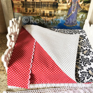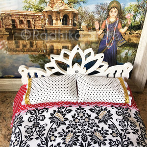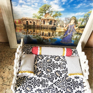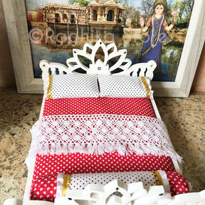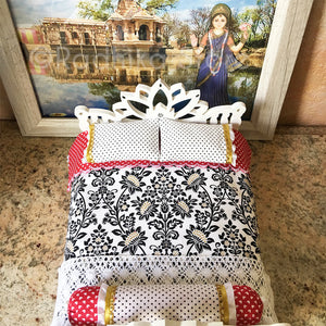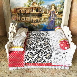 This strong, well-made, wood Deity bed, is exclusively made for Radhikastore. We painted the bed milky white. We made the pillows and the nice firm, comfortable mattress, about 3/4" inch thick, 7 1/2" inches long, by 6" inches wide. You can put your under 7" inch Deities in this bed. (The bed itself is 8" long, by 7" inches wide. The Lotus headboard is 5" inches tall at the highest point, and the lotus footboard is 4 3/4" tall. It comes as seen in photos. For those who like high quality, soft cotton fabrics ... colors of; white, black, red, with gold trim. Two-sided cotton bedspread, with a double sided cotton top sheet, fully covered cotton bottom sheet, crochet cotton blanket, two cotton pillowcases, and a cotton bolster pillow with trims.