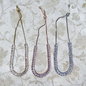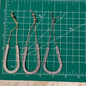 Sweet Baguette shaped and cut Faux Diamond Rhinestone Necklace with sliding adjustable chain. (gold bead slides up and down to adjust). Gold color metal. You can also cut off the chain and cut to make smaller pieces for anklets, bangles, etc.