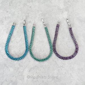 Sweet baguette cut Rhinestone (Glass crystals) Necklace with clasp Faux Silver color metal .. You could also add a string to the ends instead of using the clasp. It can also be cut into sections for bangles or anklets or anything you wish.