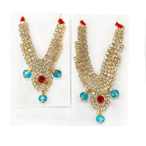 From Vrindavan - Beautiful, Good Quality Braj Mandala Rhinestones Deity Necklace. Faux Diamonds and teal color crystal beads and Faux Ruby Center Stone. With Gold color metal (Back).