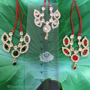 From Vrindavan - Beautiful, Good Quality Rhinestones Deity Necklace. With Faux gem colors. Please see pictures for the sizes. Choose your size accordingly. (Please do measurements to make sure you get the size you need.) The string is interchangeable. You can put any color string you like. Some devotees like to use a metallic string.