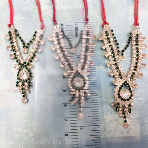 From Vrindavan - Beautiful, Good Quality Rhinestones Deity Necklace. Please see pictures for the sizes. Choose your size accordingly. (Please do measurements to make sure you get the size you need.) The string is interchangeable. You can put any color string you like. Some devotees like to use a metallic string.
