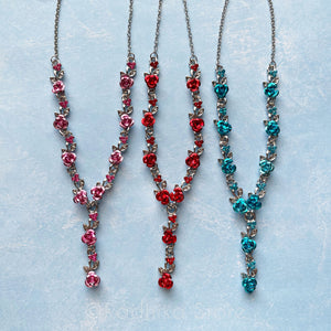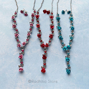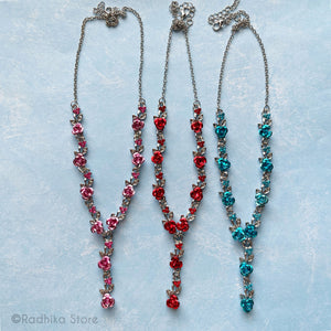 Rose Vine Design Deity Necklace. Measures- 4" inches on each side of neck. (8" total), plus 2" inches dangling pendant and extra chain link)(For larger Deities or to make into smaller Necklaces or use the flowers for jewelry. Good quality with silver color metal. See the measurement photo