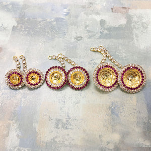 NOTE: This set has purple with clear rhinestones underneath.. Size Tiny and Small have teal blue and clear rhinestones on top and Size Medium has peridot green and clear rhinestones on top.