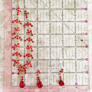 Ruby Dew Drops, rhinestone crystals necklace and earring set. With gold metal. Please see the measurement photo for the size.