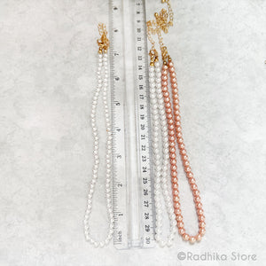 Good quality Faux Pearls. These Lovely necklaces work well for medium to large size Deities. Choose Pearl Strand.- Make them shorter by using the clasp, and make them longer by using the extra chain length.
