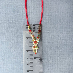 From Vrindavan - Beautiful, Good Quality Tiny Rhinestones Deity Necklace. With Gold color metal (Back). Faux Diamonds Diamonds and Ruby color stones. Tiny necklace for tiny Deities. (from 6" to up to 10" inch Deities).