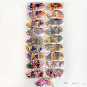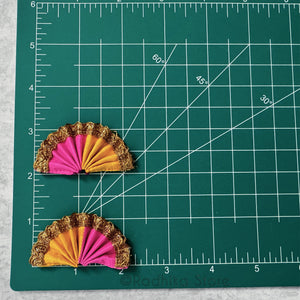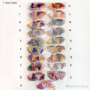 Hand-made in Vrindavan. -2 Colors Side by sideSilk Fabric, with Gold Jari trim Turban Fans. Temple quality. Looks like two fans in one, though the colors are sewn together
