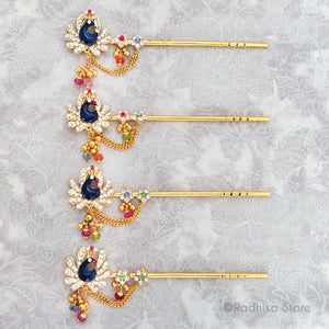 From Vrindavan - Dazzling Peacock Flute with Bells. Our biggest Vamsi flute Large Peacock Pendant with Lacquer and rhinestones. Crystal style bells (surprise colors you will get for the bells.)