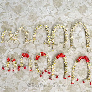 Hand-made in Vrindavan by Brajabasi's. Price varies according to size. One for this price. Soft flowers with Faux Pearls and flexible thick wire. Very sweet. Originally Intended to be flower head gear (Flower Headdress) for Srimati Radharani or Lady Subadra) Though they can also be used as Dangle Bangles for all Deites Including Lord Jagannath and Baladeva. Simply bend them in the shape you like. They can be anklets, armlets or even blets.