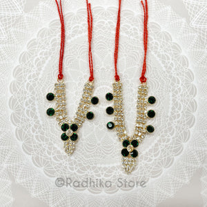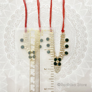 From Vrindavan - Beautiful, Good Quality Tiny Rhinestones Deity Necklace. With Gold color metal (Back). Faux Diamonds and Emeralds color stones.