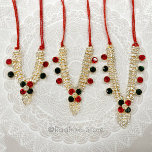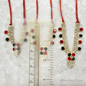 From Vrindavan - Beautiful, Good Quality Tiny Rhinestones Deity Necklace. With Gold color metal (Back). Faux Diamonds and Emeralds and Ruby color stones.