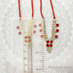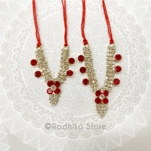 From Vrindavan - Beautiful, Good Quality Tiny Rhinestones Deity Necklace. With Gold color metal (Back). Faux Diamonds and Ruby color stones.