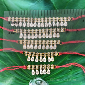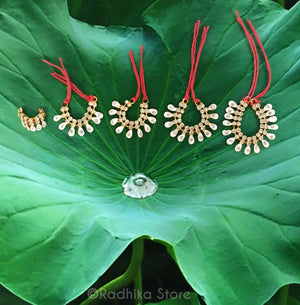 From Vrindavan - This Price for one necklace. Beautiful, Good Quality, Rhinestones. Sweet flower petal design. Can be used as a bangle, ankle bell, necklace or belt. The string is interchangeable. You can put any color string you like. Some devotees like to use a metallic string.