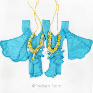 Measure Sri Sri Gaura Nitai from the waist to the top of His lotus feet, with an inch ruler or tape measure. The dhoti length in the Size section shows how long the front section hangs. That will determine the size you need. (For example, if your measurement is 4" inches from waist to top of Their Lotus Feet, then you need the 4" inches dhoti size) Choose that is that size.