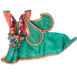 Hand Made in Vrindavan by ISKCON Devotees.  Medium peach color with Teal Green Best quality Faux Silk, with cotton lining. Fully framed with sparkling sequin. Sewn nicely. No strings to cut. Fitted Kurtas (Shirts) And nice belts that may be used with other outfits.  This outfit would match best with Silver or Gold color accessories and the colors listed above, or contrasting colors. It's unlimited. (See Deity Crowns and Necklace Sets and Deity Jewelry to find accessories).