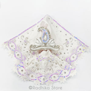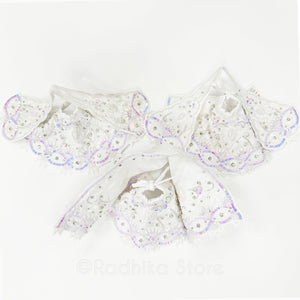 Perfect for Purnima, or almost any festival., soft white silk, with white cotton lining.) Not stiff) Tiny white opalescent sequin that reflects lavender and pinks and teal colors High-quality, detailed, intricate, embroidery with Best quality little faux pearls and lots of glistening tiny silver glass beads rhinestones and silver studs.