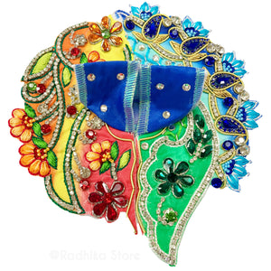 NOTE: When dressing your Laddu Gopal, the opening goes in the front for all the Gopal Skirts. You may have to open the seam on the shirt in the back to make them fit properly. For the tiny Laddu Gopals, if His shirt is too big, we recommend removing the blouse by cutting it out and putting a small ribbon around Him or cutting the shirt fabric in half after removing it then put it back. (They do not make the shirts small enough for the small Gopals'. (We have no idea why they don't make them smaller.) But this process works nicely.