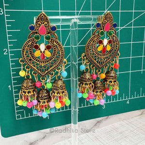 Fun Multi Color Jhumka Earrings. With Gold color metal, post earrings.