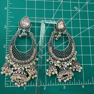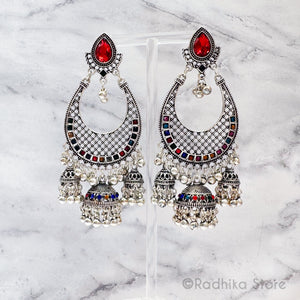 Beautiful, Large Vedic Style Jhumka, earrings. Silver color. Choose stone color. Light weight for their size. Lots of movement