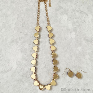 Heart Shaped Faux, Crystal Rhinestones, Deity Necklace. Pink with 2 colors of purple hearts. The earrings are purple and the hooks can be removed if needed.