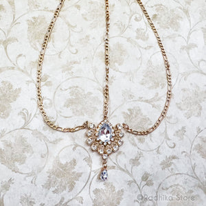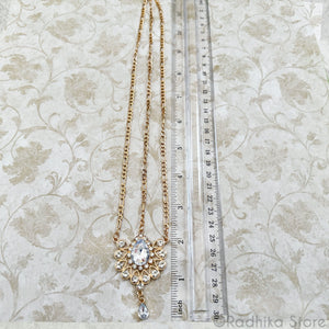 Stunning Tika with clear glass crystals. Choose Golden or Silvery color metal. It can also be used as a necklace or belt or turban piece. (Remove the center chain).. if needed.