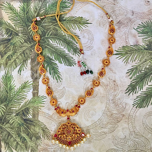 Gorgeous Paisley Peacock with flowers necklace, with high-quality faux rubies and pearls. High fashion, antique 24 Karat India gold look. The Necklace length is 16 inches plus The swinging pendant is 2 1/2" inches long by 2 1/2" inches at the widest part, with a gold look rope that can extend long. Seed beads and glass beads on the end of the rope.