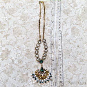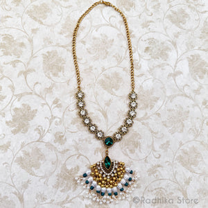 Beautiful Vedic design (Style Popular in Temples) Gold color metal, with pearl Jumka Style necklace and earrings, Faux gold, emeralds, diamonds and pearls.