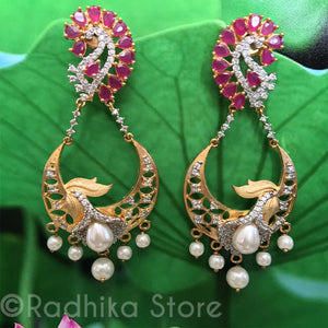 High fashion Bollywood style earrings. Lovely 14 karat Gold look with rhinestone and faux pearls, and faux Ruby. 2 1/3 inches long 1 1/4 inches wide at the widest part. The lower portion of the earrings swing. Lots of bling and lovely movement.