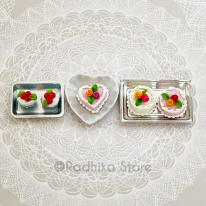 Not edible.. Manaseva.. Means to offer in the mind. A cute decoration and offering for Their Lordships to increase ones meditation. We can simply offer this as a real cake in our mind to Their Lordships. This lovely tiny cake sits on a paper doily and can sit on any of the tables we offer. It can also be placed in Srimati Radharanis hand using a little Tickey-Tack- (See other listing in Miscellaneous section). Trays sold separately.