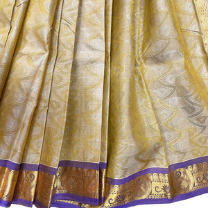 High-quality Silk saree. Golden Olive color. (GoldThreads. Divine-looking colors with deep purple and Gold Jari border. Purple and Gold thread embroidery Palu. (Head Dress) Purple and gold Blouse (Choli Fabric) Medium weight and cooling silk, fabric. Good for weddings, festivals, or any special occasion.