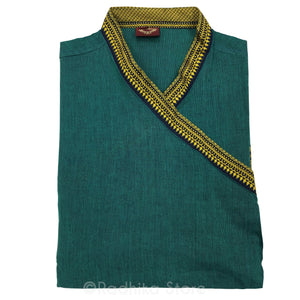 Dark Green Festival Bagalbandi also known as Bundi Style Kurta, with gold and blackish dark blue trim (The picture looks more yellow but it is more gold than yellow trim.) With side pockets. Simply tie them on inside and on the side. Looks amazing.